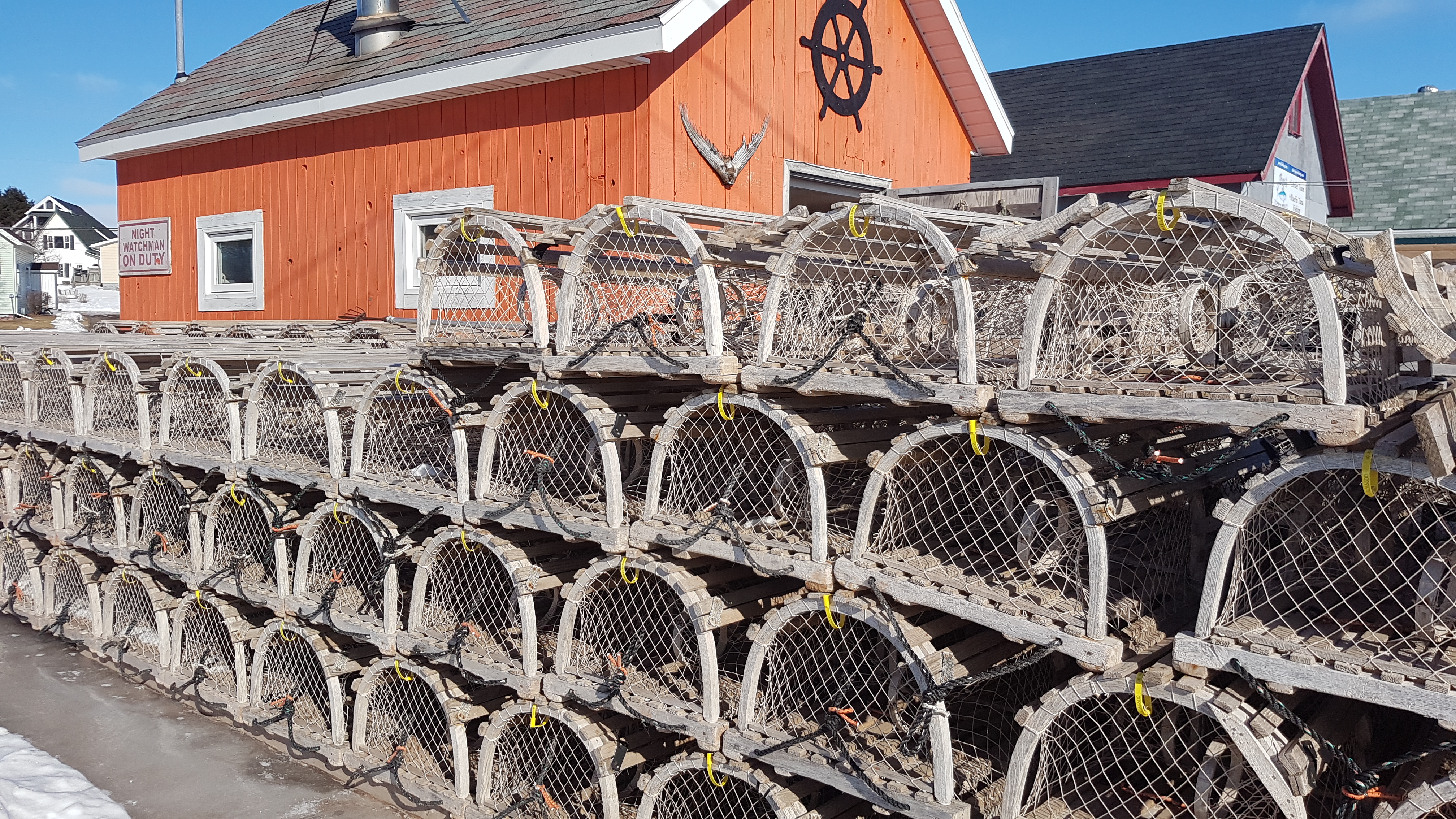 Kuttern und bunt angemalten Bootshäusern stapeln sich dutzende Hummerreusen.