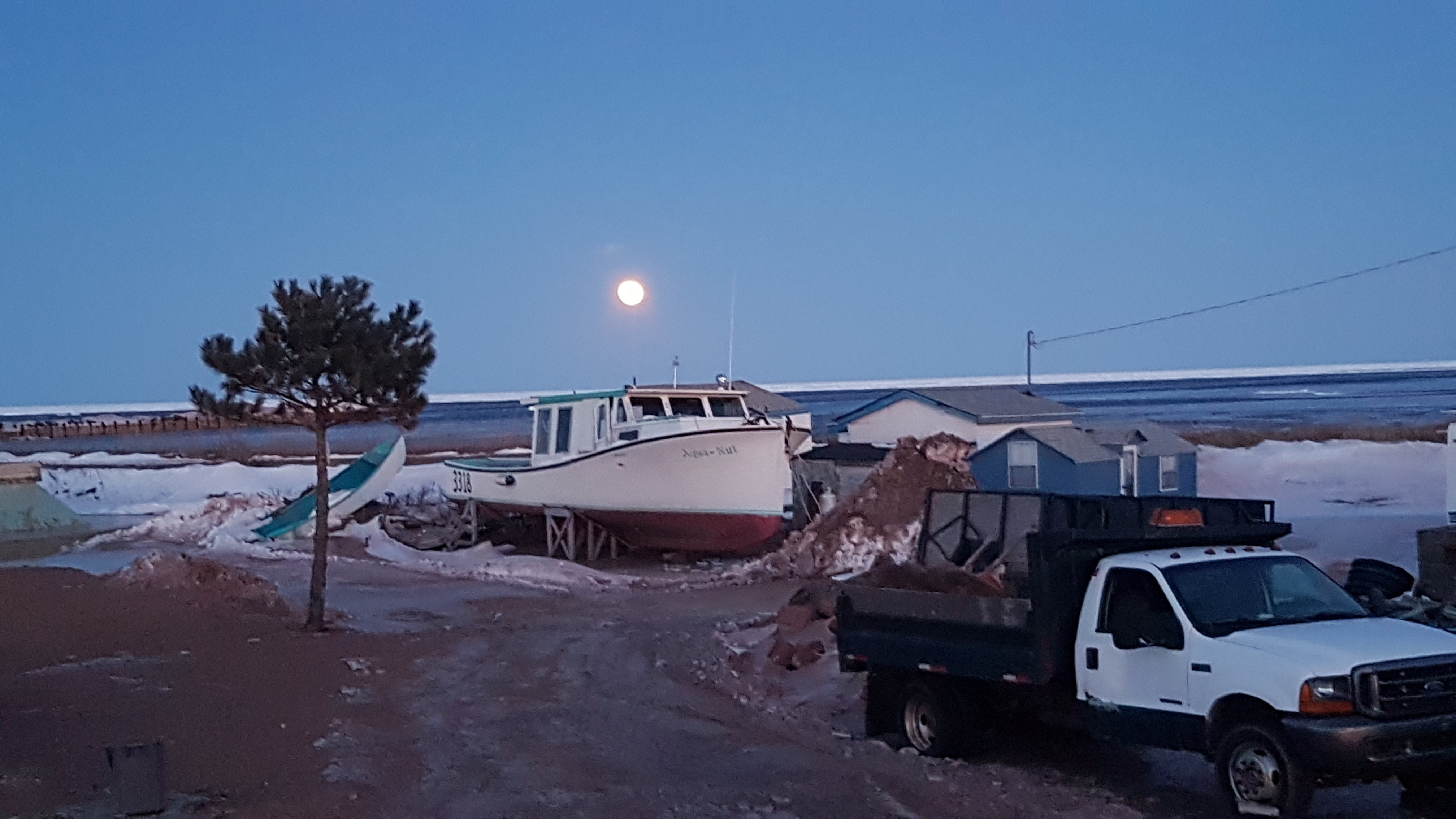 Vor dem Haus zeichnen sich dunkel ein paar Umrisse gegen den Mond und die nackte rote Erde ab. Rechts ist ein Boot aufgebockt, das Weiß von ein paar Pickups glänzt, ein Wohnwagen aus den 50ern steht herum. Links ist eine Hütte zu erkennen. In ihr wurde vor rund hundert Jahren Ahornsaft zu Sirup verkocht. Frank hat sie gekauft, hierher gekarrt und renoviert. „Für die Touristen im Sommer“, erklärt er. Mit schnellen Bewegungen deutet er auf die eine oder andere Stelle unten im Hof, erklärt, was er vorhat, was er noch bauen, noch verändern will. Das Gelände ist wie ein Spielplatz für Erwachsene. „Boys and their toys. Er lacht. Sogar das aufgebockte Boot will er ausbauen, damit man drin wohnen kann. Es ist sowieso nicht mehr seetauglich.