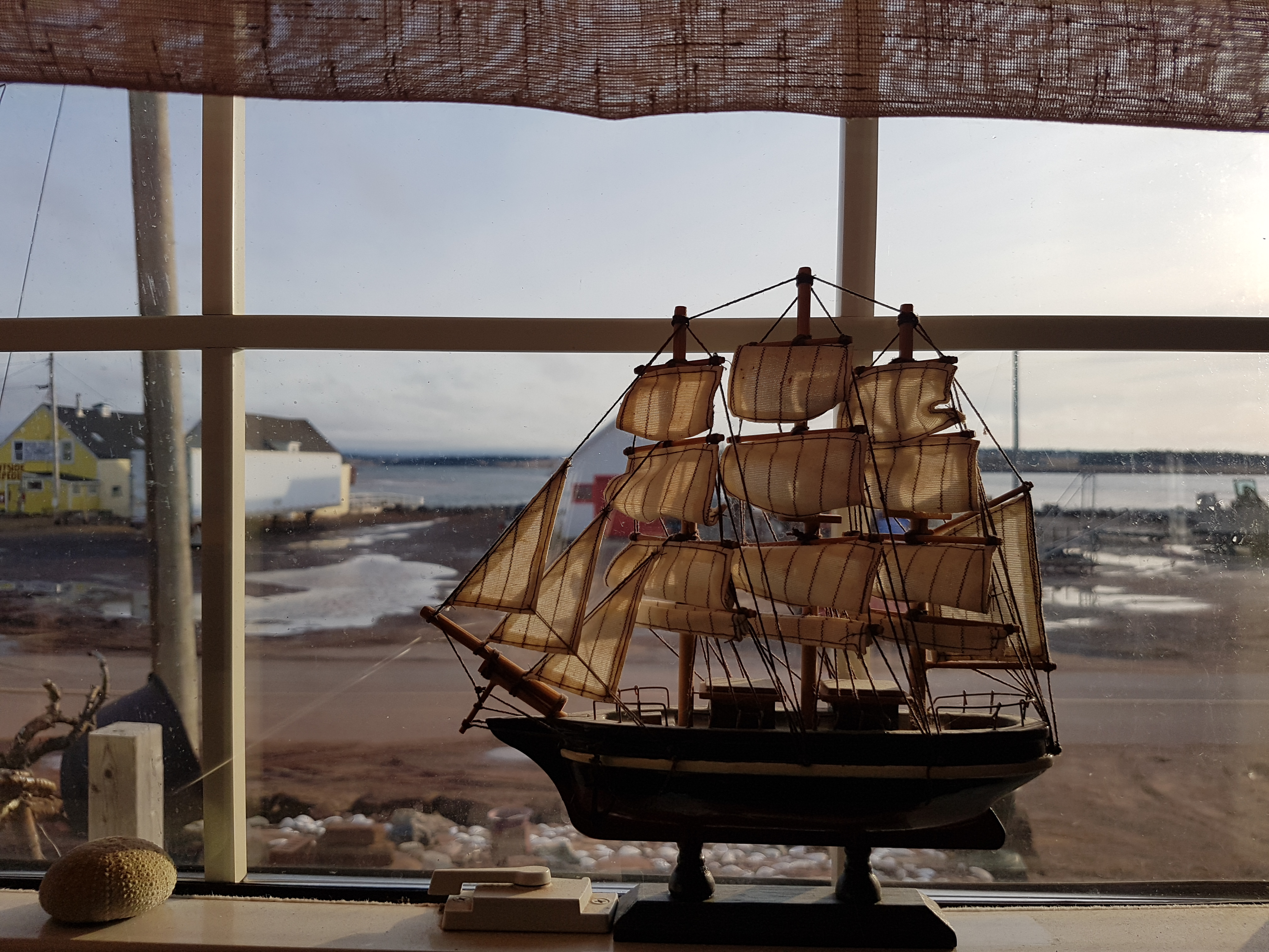 In seinem Haus fühlt man sich derweil wie in einem Touristenladen an der Nordseeküste: An der Wand hängt das Portrait eines Kapitäns mit Vollbart und Pfeife. Vor den Sprossenfenstern stehen Selgeschiffchen. Sogar einen Postkartenständer gibt es. Was es damit auf sich hat? Mein Gastgeber erzählt die Geschichte von Samira, auch sie war eine seiner zahlreichen Couchsurfer. Die Taiwanesin kam als brotlose Künstlerin nach Kanada und über Umwege zu Frank, wo sie eine Weile blieb, und anfing, Boote, Leuchttürme, den Strand zu malen – alles, wegen dem sie sich in die Insel verliebte. Frank war begeistert. „Warum verkaufst Du deine Bilder nicht den Touristen von den Kreuzfahrtschiffen? Damit könntest Du hunderte Dollar verdienen.“