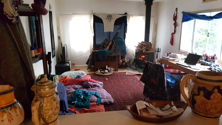 Die Unterkunft: Ich habe meine eigene Hütte – ein Schiffscontainer mit vorgelagerter Terrasse, ausgerichtet auf die Bucht. Im Wohnzimmer, hinter einem Vorhang im Türrahmen, der es vom Rest des Palastes abteilt, sitze ich vorm Ofen im T-Shirt. Muss ich ins Bad, streife ich mir zwei Pullis über und sehe meinen Atem, wenn ich am Ende die Kerzen ausblase – das Deckenlicht hat schon vor langer Zeit den Kontakt zum Schalter abgebrochen, vielleicht fehlt auch einfach die Glühbirne, wer weiß, jedenfalls fehlt das Klopapier. Weder in der Halterung, noch im Wandschrank ist welches zu sehen, dafür liegt im Waschbeckenunterschrank ein goldener Wasserhahn, den man irgendwo einbauen könnte, aber dafür bräuchte man ein Marmowaschbecken, mindestens eines aus Keramik, keines aber aus grünem Kunststoff.